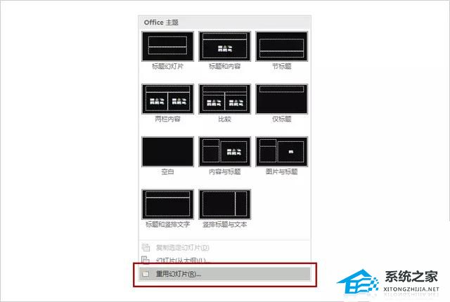 点击上方工具栏【开始】-【新建幻灯片】-【重用幻灯片】;