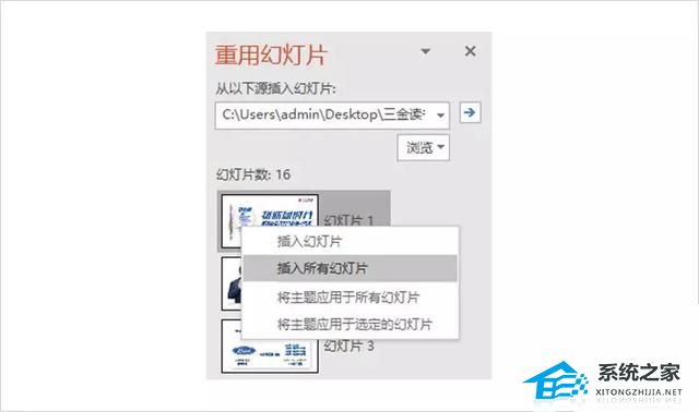 勾选底部【保留源格式】,然后右键选择【插入所有幻灯片】: