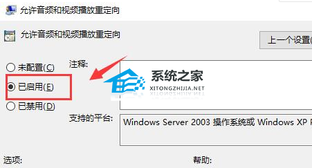 4、找到并双击打开“允许音频和视频播放重定向”选项。