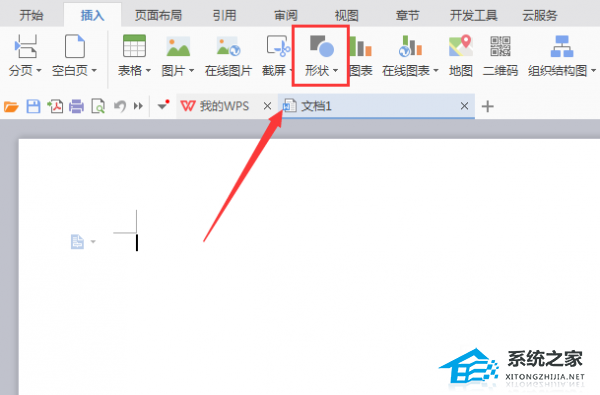 3、点击插入选项,在其编辑工具区里找到形状选项,如图所示:
