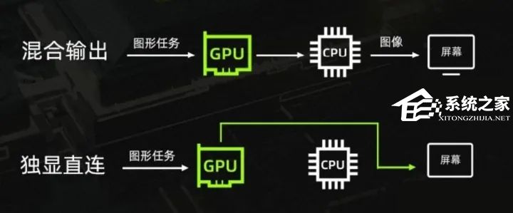 当我们了解了混合输出模式下的图像输出方式,再来了解独显直连就更加的清晰了,独显直连从字面意思就可以了解到,就是显卡和台式机显卡一样,单独工作,不在回传给CPU,并且电脑系统也无法在识别到核显。