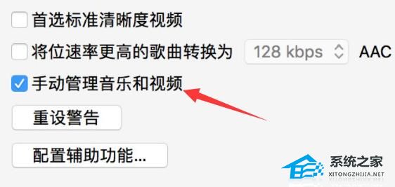 3、然后将右边选项里的“手动管理音乐和视频”选上。