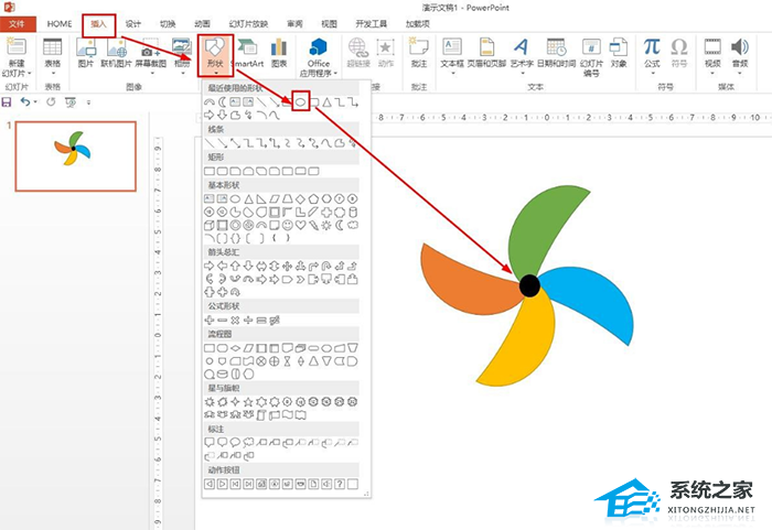 点击插入——形状——选择椭圆——在叶片中心画一个圆形——在格式中设置圆形为黑色。