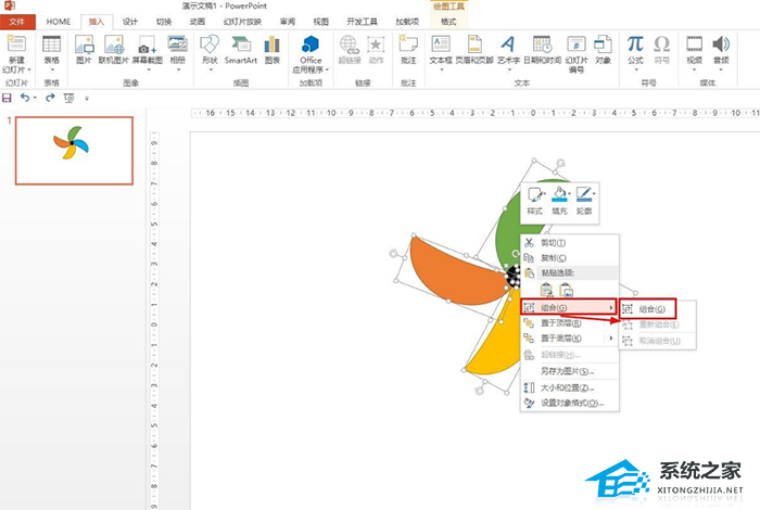 选择所有形状——右击——选择组合——组合,叶片和中心圆组合成一个形状。