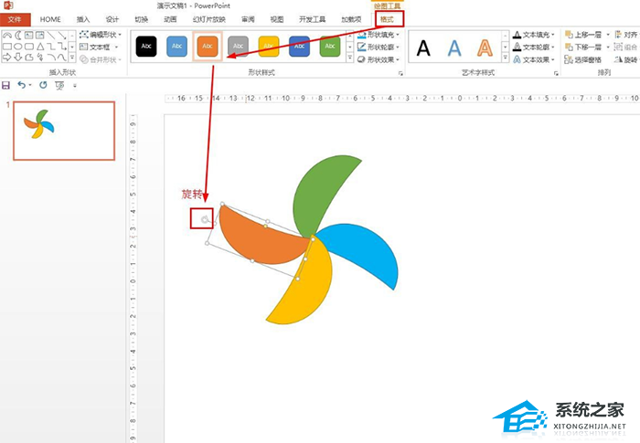 接着点击格式填充不同颜色——拖动并旋转不同的角度摆放成风车的样子。