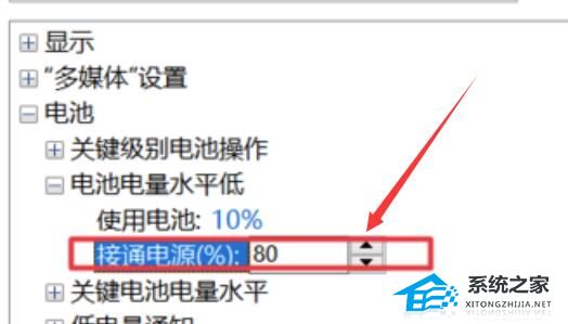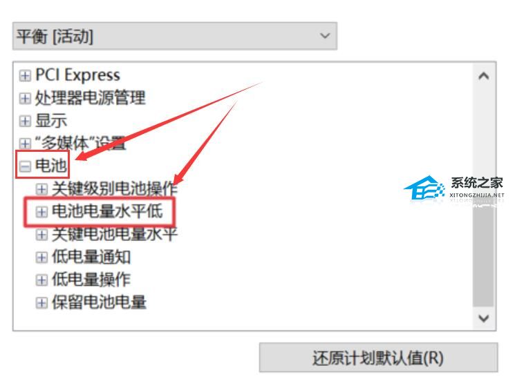 5、进入之后,我们点击展开【电池】-【电池电量水平低】选项。