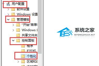3、然后在左边依次进入“用户配置”-“管理模板”-“控制面板”-“个性化”。