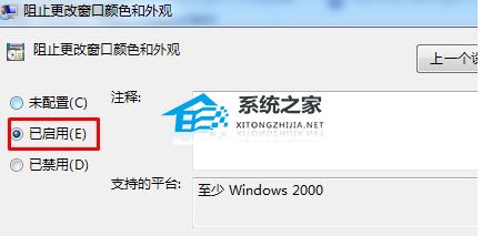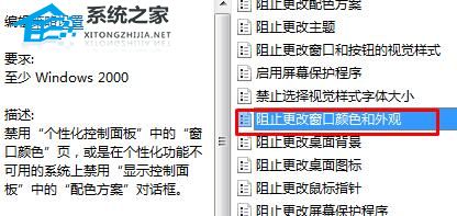 4、双击打开右侧的“阻止更改窗口颜色和外观”。