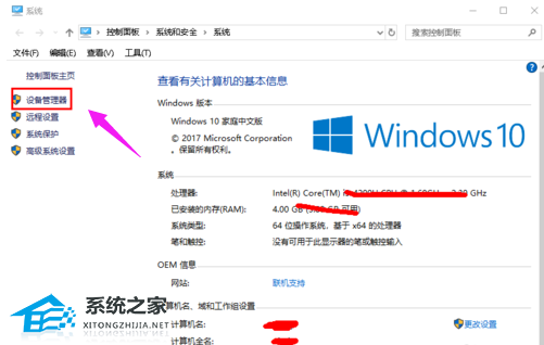 2、在属性中的电脑基本信息界面中选择设备管理。