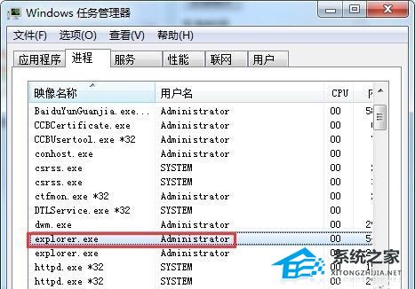 1、打开“任务管理器”,确认“explorer.exe”是否正常运行。