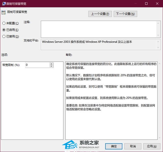 5、双击“限制可保留带宽”,这里默认为未配置状态,把状态设置为已经启用,这时输入框即显示默认的是80,我们把带宽限制百分比改为0,点击确定,就能解除限制。