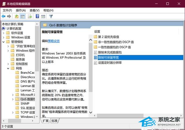 4、再次在本地组策略编辑器中找到并展开,计算机配置--Windows 设置--管理面板--网络--QOS数据包计划程序--限制可保留带宽;