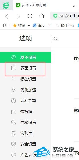 3、这时会进入360安全浏览器的设置页面中,在页面左侧的菜单栏中可以看到“界面设置”这一项,点击切换到界面设置页面中;