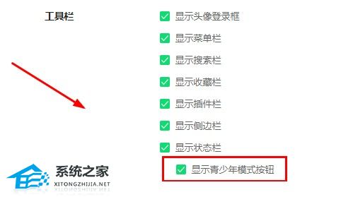 4、在界面设置页面中找到“工具栏”这一栏,在其右侧将“显示青少年模式”勾选起来,这样我们就可以通过状态栏中的青少年模式按钮快速打开青少年模式了。