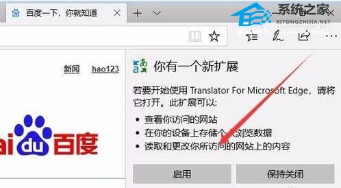 8、同时edge浏览器也会弹出一个新安装扩展的提示,点击“启用”按钮。